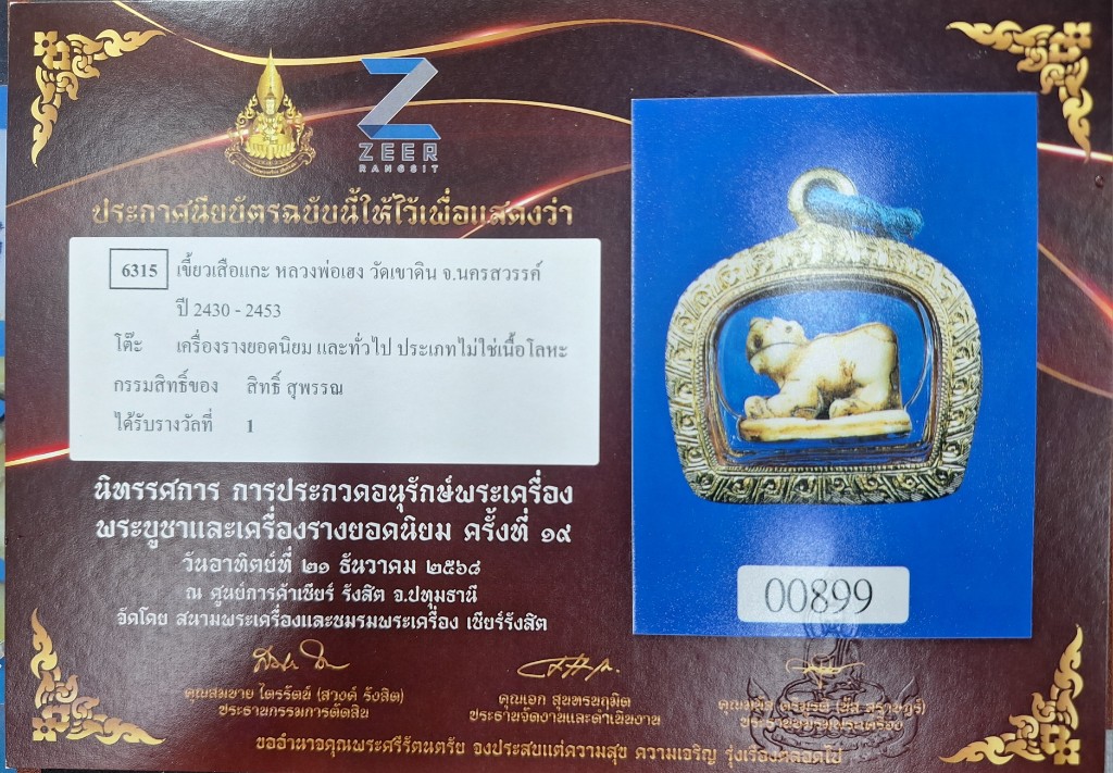 รับประกันพระแท้ตลอดชีพ(2.0) ข้อมูล หลวงพ่อเฮง วัดเขาดินใต้ จ.นครสวรรค์ ท่านเป็นเกจิอาจารย์ร่วมสมัยเดียวกันกับหลวงพ่อเดิม วัดหนองโพถือว่าเป็นสุดยอดเกจิอาจารย์ยุคเก่าอีกท่านหนึ่งของเมืองนครสวรรค์โดยมีผู้ศรัทธาเสาะแสวงหาเครื่องรางของท่านกันเป็นจำนวนมากโดยเครื่องรางของท่านมีคุณวิเศษเอกอุทางแคล้วคลาด,มหานิยม,มหาอำนาจในการปกครองคนของผู้มีอำนาจหรือผู้บัญชาการใช้หลักพระเดช-พระคุณแก่คนผู้ใต้บังคับบัญชาหรือลูกน้องเป็นอย่างยิ่ง -หมายเหตุ1 เสือลพ.เฮง วัดเขาดินใต้ส่วนใหญ่ที่พบเจอแกะจากงาช้างสำหรับเสือแกะตัวนี้พิเศษหน่อยครับเสือแกะจากเขี้ยวเสือที่มีไซค์ขนาดเล็กมากฯ(วัดจากฐาน1.3ซม)และเป็นศิลปพิเศษหางแตะพื้นที่พบเจอได้น้อยมากฯครับ -หมายเหตุ2 ส่งเข้างานประกวดศูนย์พระเครื่องเซียร์รังสิตณ.วันที่ 21-12-68 ผลมีโบว์แดง๑ติดกล่องครับ